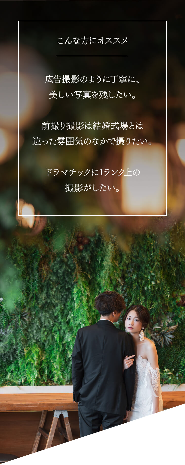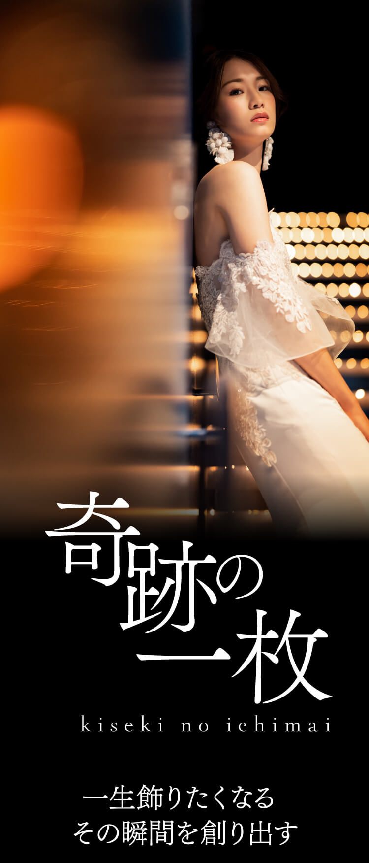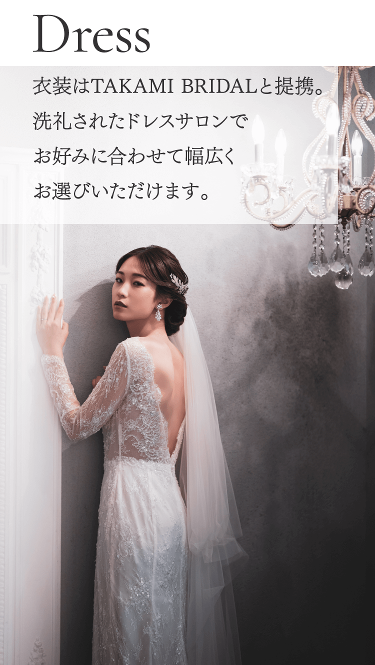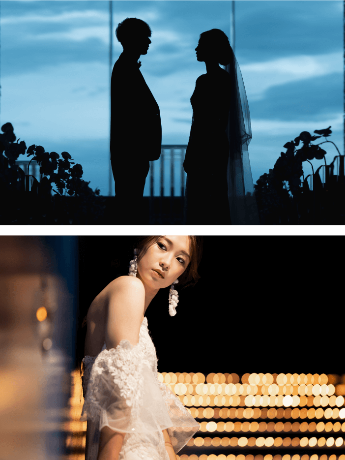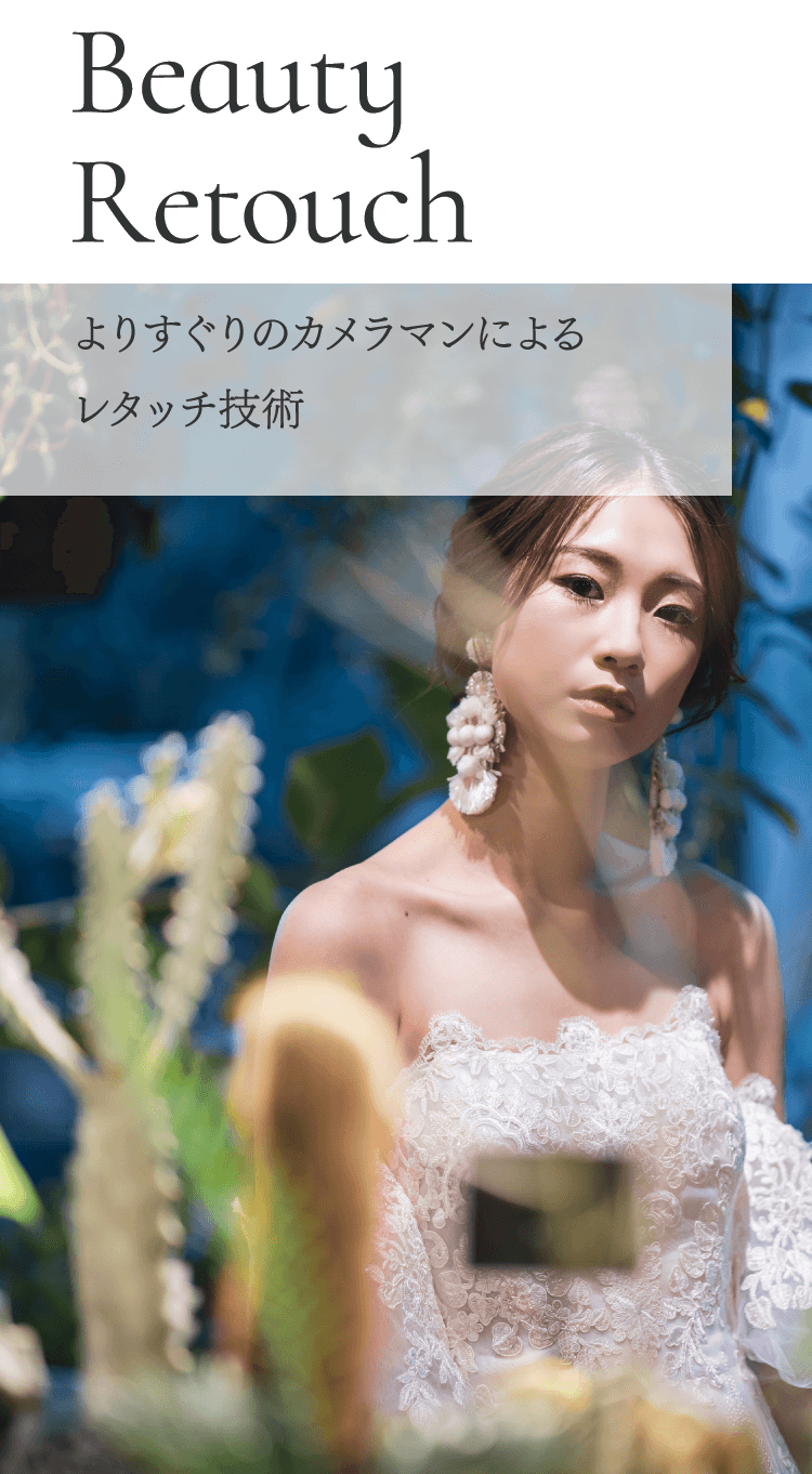 撮影後の大切な仕上げにもこだわります。 お肌などの色補正はもちろん、ドラマチックな1枚もお好みのスタイルをお伺いの上で仕上げます。 カメラマンはもちろん、ヘアメイクも長年勤めてきた私たちが選びぬいたこだわりのクルーです。